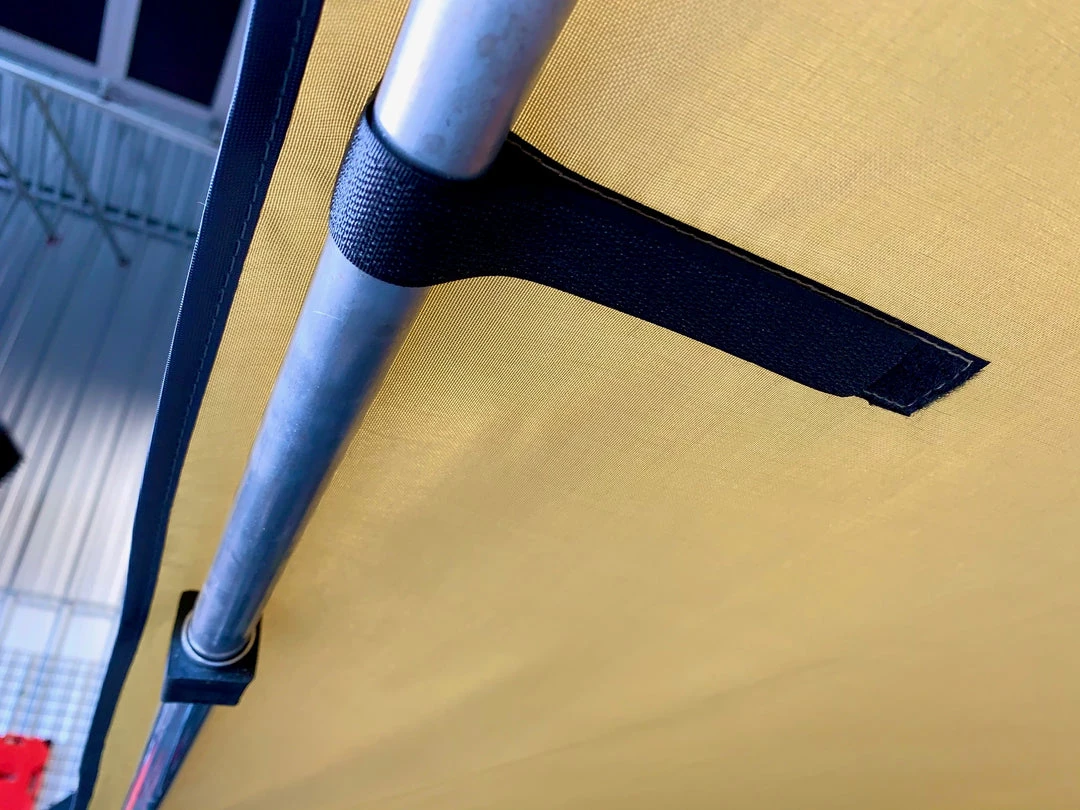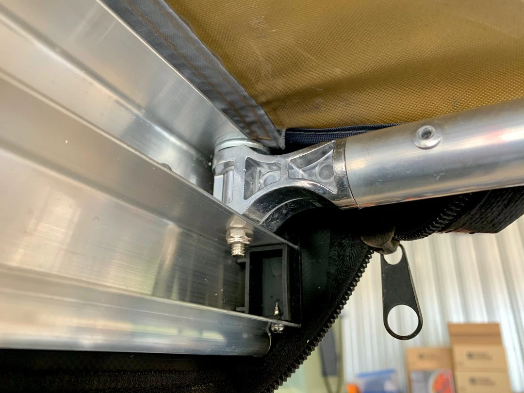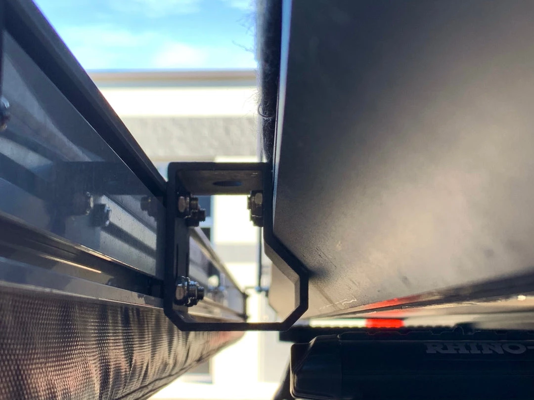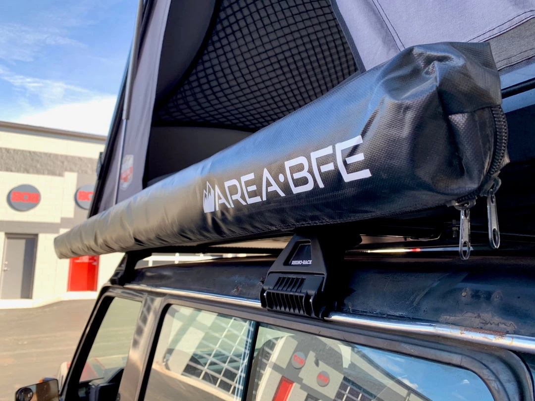 The Area BFE awning measures 80″ wide which fits the footprint of their Black Series perfectly. It extends 8ft out and is Tan in color. The awning come standard with “L” brackets and hardware you’d find on any traditional awning for a universal mount. If you’re looking to mount it with your Area BFE Black Series Aluminum Clamshell, you can upgrade to the Area BFE Tent mount kit that allows you to mount directly to the tent, making your set up high and tight, for a clean look. Please note, whether you choose the upgraded brackets or not, the stock “L” brackets will come with your awning regardless. Also note, this awning and upgraded tent mount awning bracket is compatiable with other Aluminum Clamshells like Roofnest and CVT.