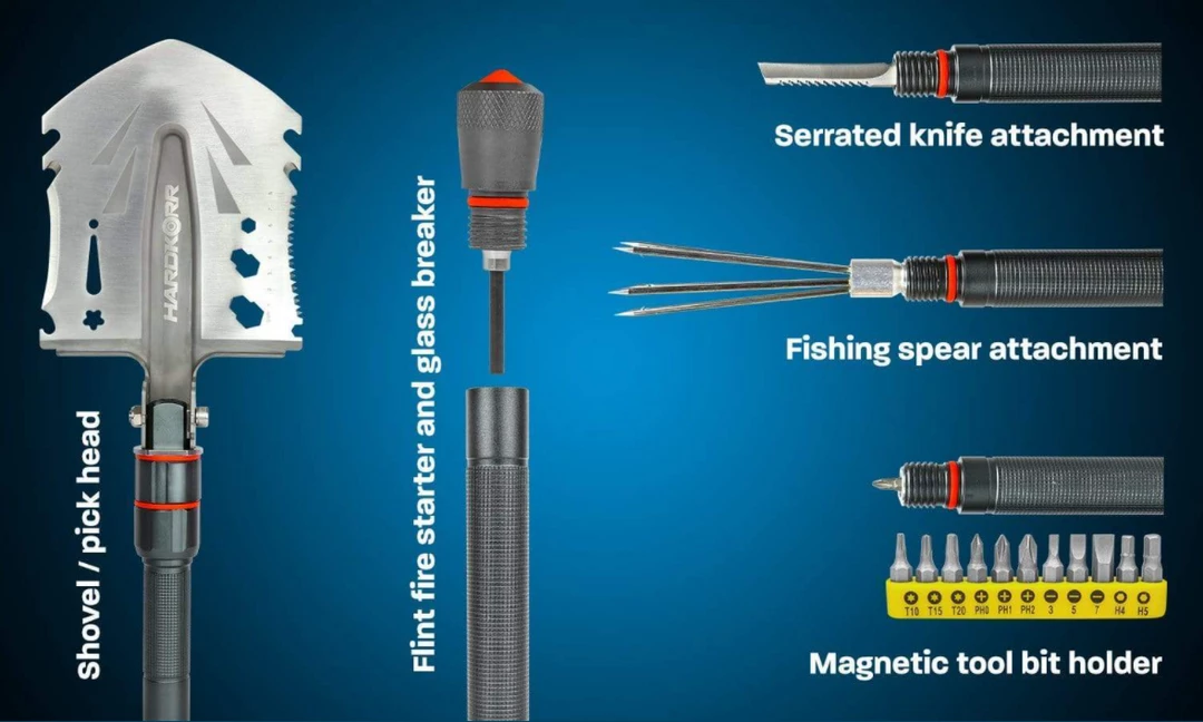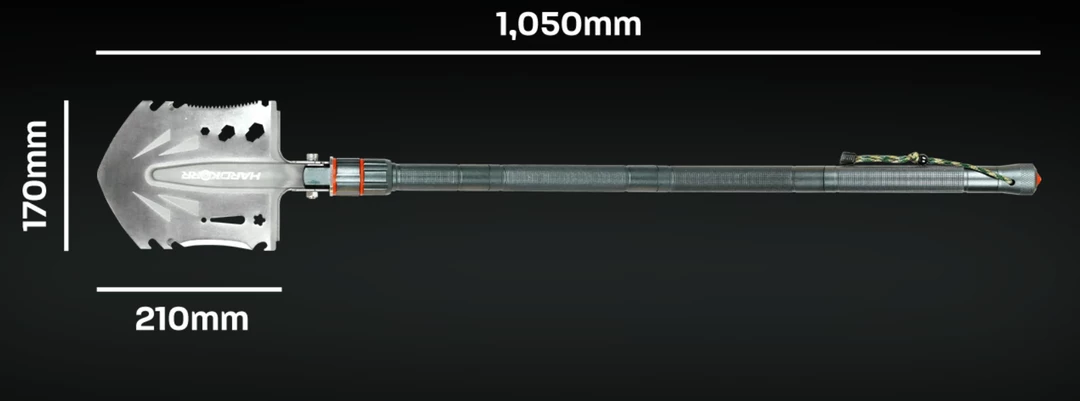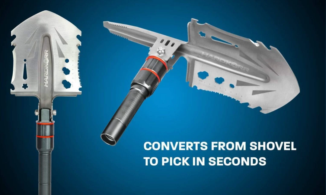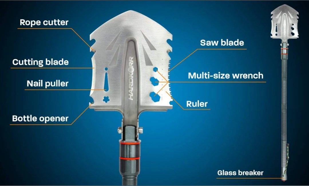 Versatile just doesn’t even begin to describe this thing. You can dig holes, you can shovel dirt or snow, you can chop branches, you can cut vegetables, you can saw wood, you can catch fish, you can undo bolts, you can tighten bolts, you can open bottles, you can start a fire, you can undo screws, you can tighten screws, you can hammer nails, you can remove nails, you can measure things, you can cut rope, you can cut wire, you can scale fish, you can break glass, you can break up ice or hard ground, you can turn it into a hoe to remove plants or weeds that are in your way, you can dig out bogged vehicles, and you can use it as a hiking pole. There’s probably more uses, but we’ll leave that up to your imagination!