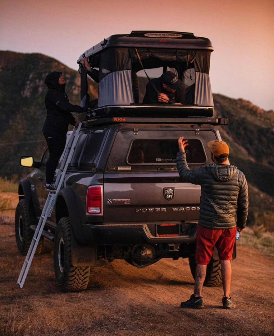 Rooftop tents come in all shapes and sizes, but James Baroud stays true with their sleek design and functionality. We love the ease of use with patented gas strut-assisted opening – less than 90 seconds to deploy and equally easy to close. Inside the tent you will find a storage pocket for stowing your belongings as well as an additional ceiling storage cargo net for larger gear. Mounting points on both sides allow you to easily access your tent by a specially-designed telescoping aluminum ladder. The unique design automatically adjusts to the height of your vehicle so you can quickly access shelter.
