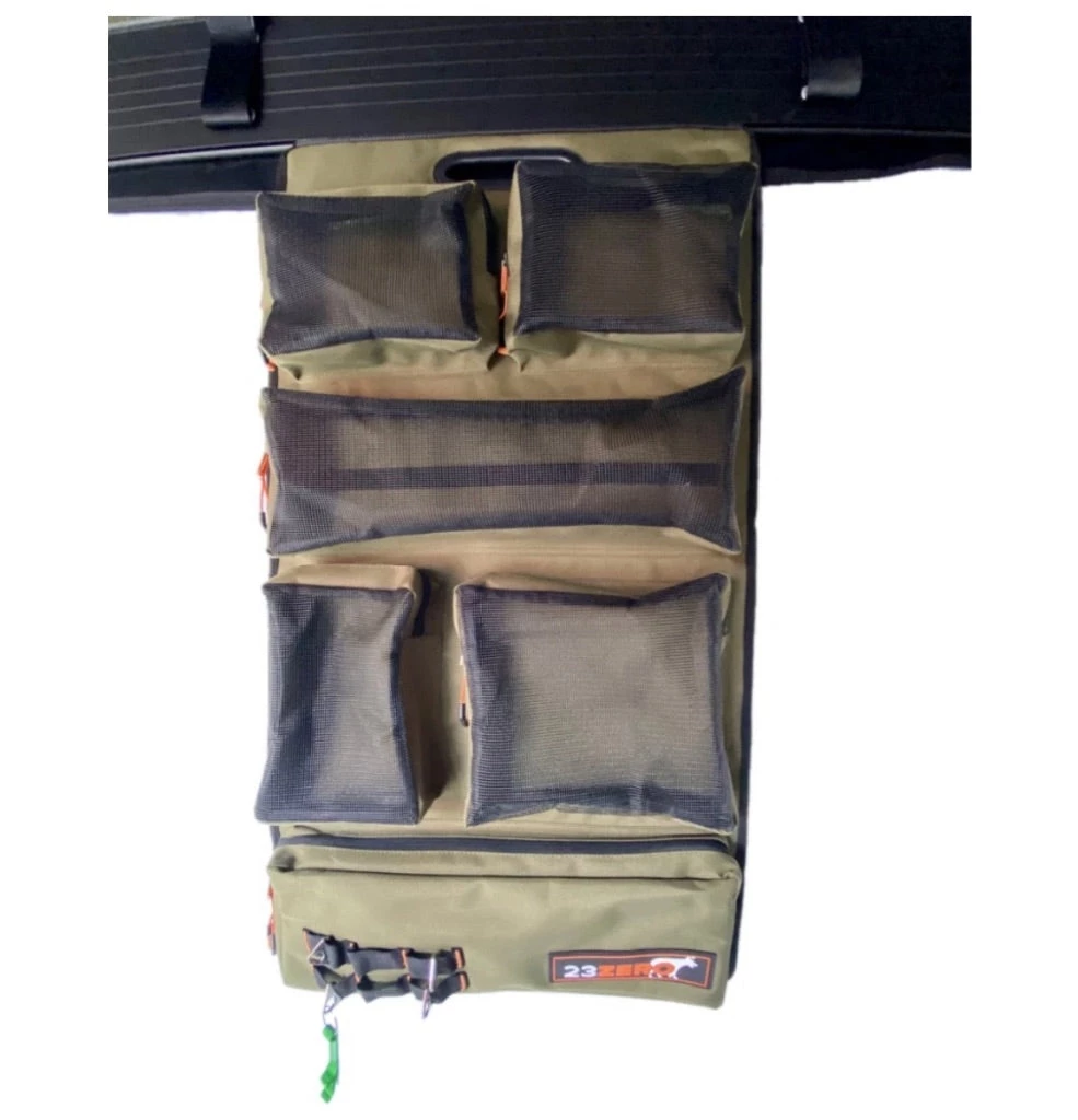 A “take anywhere” pantry is a must for any camper or tourer. Salt, pepper, coffee and sugar are just some of the essentials when we go away, so why not have a permanent place for them in the Utility Hanger, 23Zero’s roll up hanger. 5 generously sized zippered pockets with mesh fronts for easy content viewing and 1 large zippered enclosed pocket, the Utility Hanger can also be used to store first aid kits, insect repellents, flashlights, batteries or any other camping odds and sods that require easy reach. The 8mm Keder rope tape easily slides into any standard rope track ( on the Peregrine Awing or Roof top tent base) or use the hook & loop straps to suspend the Utility Hanger from any awning near your camp set up.