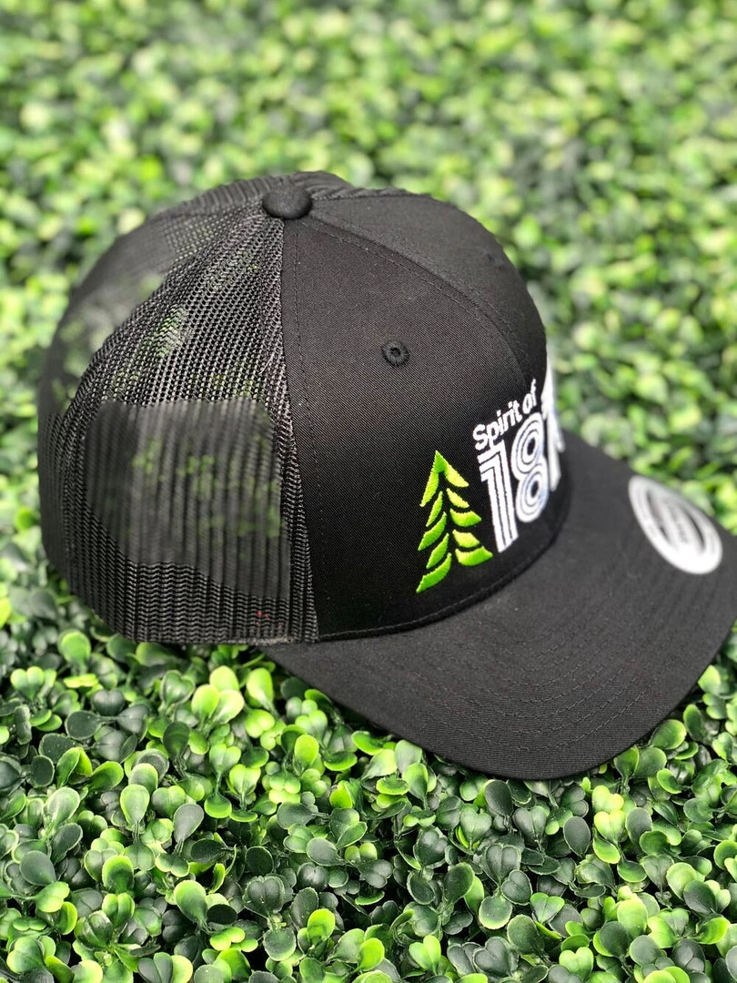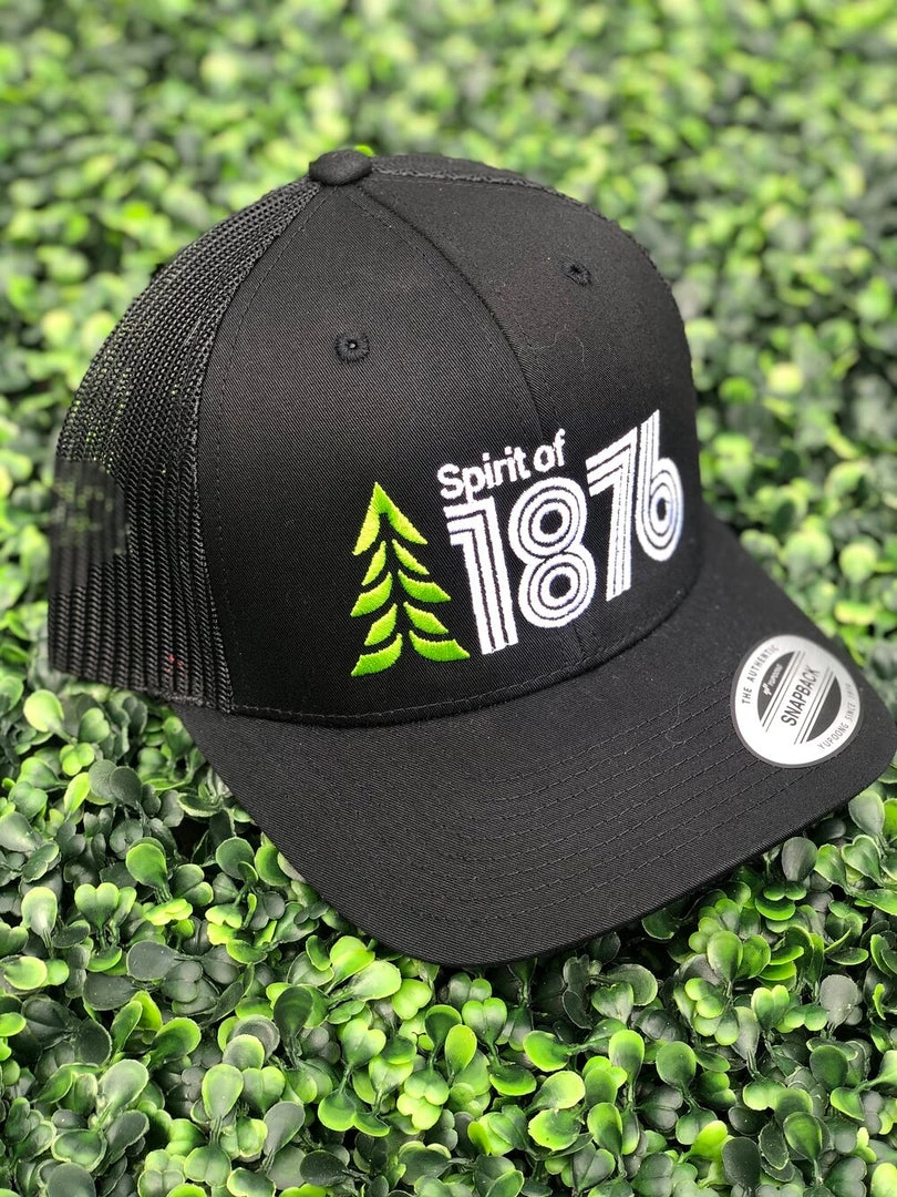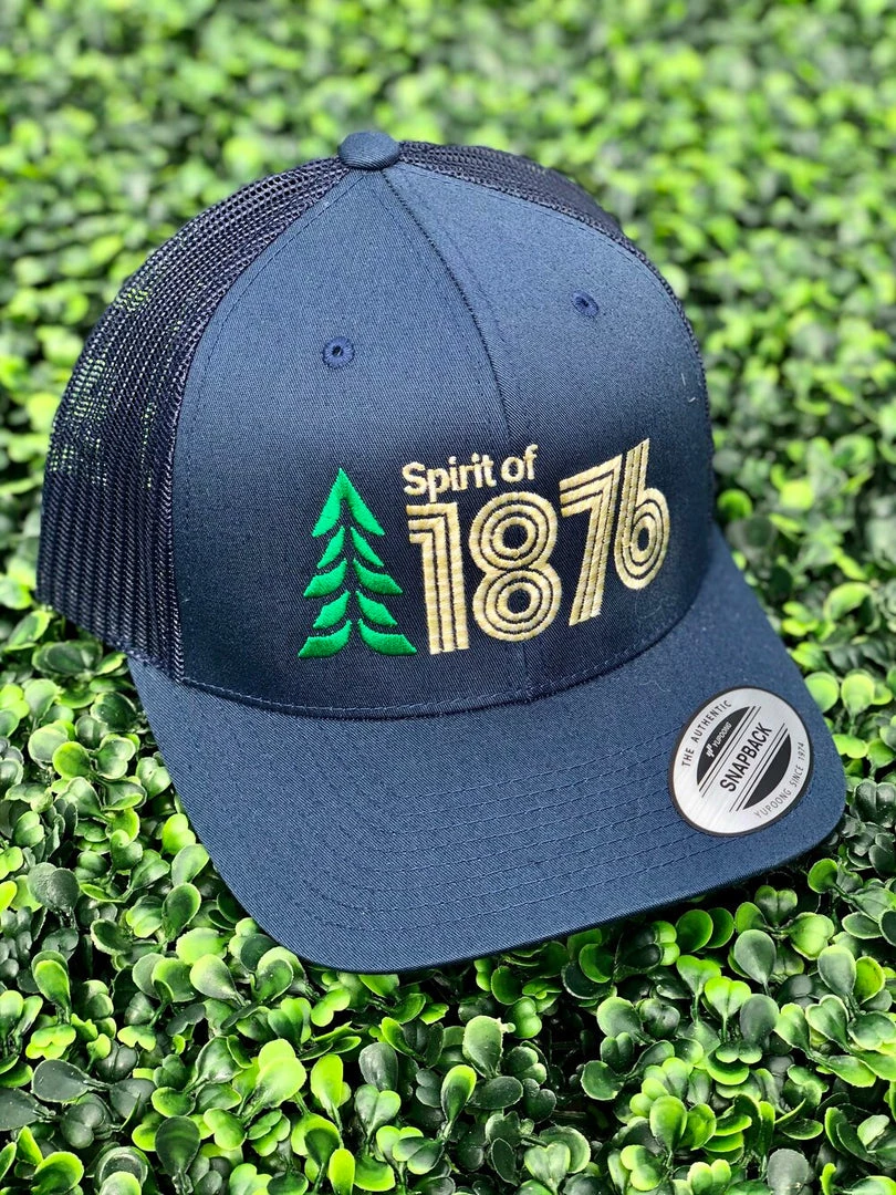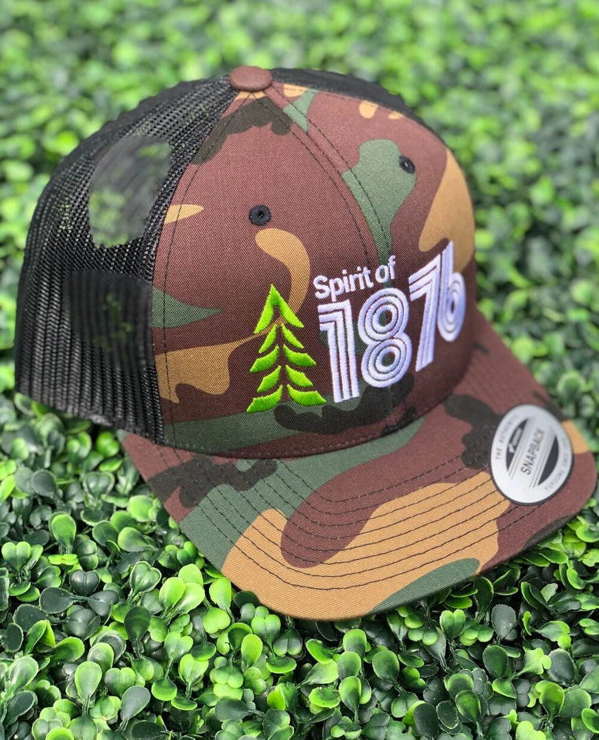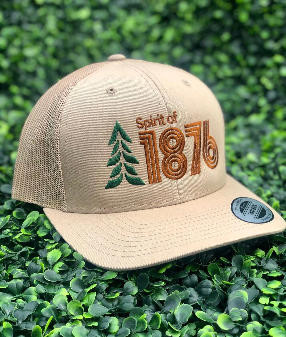 Classic trucker with a modern twist. This low profile curved bill trucker contains both The Spirit of 1876’s logo and its spirit. Ships for FREE and Plants a TREE.